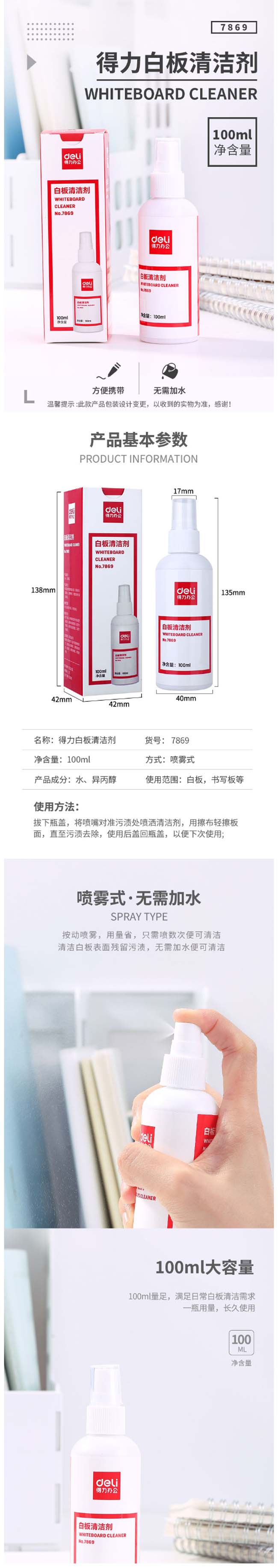 得力(deli)白板、黑板、绿板清洁剂白板配件7869