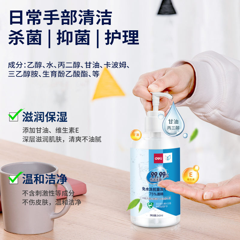 得力31001免水洗抗菌洗手液(透明)(240ml/瓶)