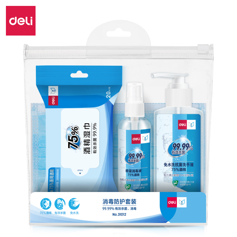 得力31011消毒防护套装(透明)(60ml+50ml+湿巾)/包)